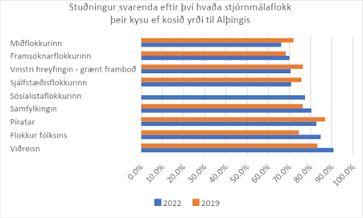 Mestur er stuðningurinn meðal kjósenda Viðreisnar eða 90,8% en minnstur hjá kjósendum Miðflokksins eða 66,1%. Stuðningur við dánaraðstoð hefur aukist frá 2019 meðal stuðningsmanna Viðreisnar, Framsóknarflokksins, Samfylkingarinnar og Flokks fólksins en minnkað lítillega meðal kjósenda Miðflokksins, Pírata, Sjálfstæðisflokksins og Vinstri hreyfingarinnar – græns framboðs. Vegna þess hve úrtakið var lítið fyrir þá sem segist styðja Miðflokkinn og Flokk fólksins skal túlka þær niðurstöður með varúð. Ljóst er þó að mikill meirihluti kjósenda í öllum flokkum styður dánaraðstoð, líkt og sjá má í meðfylgjandi línuriti.